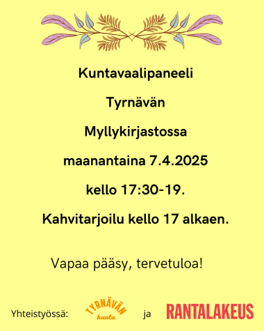 07.04.2025 17:00 - 07.04.2025 19:00 Vaalipaneeli Tyrnävän Myllykirjastossa 7.4. klo 17:30 alkaen Tyrnävän kuntavaalipaneeli on maanantaina 7.4.2025 Myllykirjaston lehtisalissa kello 17:30-19:00. Kahvitarjoilu kello 17:00 alkaen. Paneelin on kutsuttu yksi osallistuja jokaisesta Tyrnävällä kuntavaaliehdokkaita asettaneesta puolueesta. Paneeli järjestetään kunnan ja Rantalakeudesta -lehden yhteistyönä. Paneelin juontaa Rantalakeus-lehden päätoimittaja Henna Lammi. Tilaisuus myös striimataan Tyrnävän kulttuuritoimen YouTube-kanavalla: https://www.youtube.com/@tyrnavakulttuuritoimi727 Vapaa pääsy, tervetuloa!