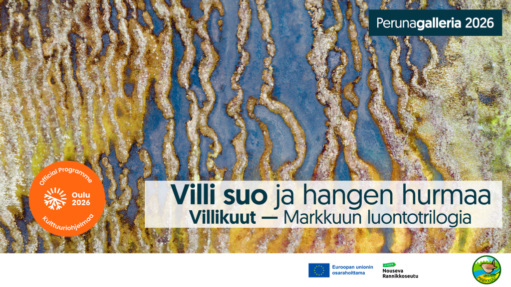 01.11.2026 17:00 - 01.11.2026 19:00 Villi suo ja hangen hurmaa (Villikuut – Markkuun luontotrilogia) Villi suo ja hangen hurmaa -tapahtuma sunnuntaina 1.11.2026 klo 17–19 Luonto- ja hyvinvointitalo Peukaloisessa. Valokuva: Mika Honkalinna Villi suo ja hangen hurmaa Kiehtova suoluonto ja talven estetiikka kuvittavat illan esitystä. Mika Honkalinnan pohjoisen luonnon kuvat nostavat esiin myös ajankohtaisia ympäristöteemoja. Luonnontilaiset suot ovat kappale kaikkein alkuperäisintä luontoamme. Osaammeko arvostaa niitä? Entä ovatko lumitalvet pian vain muistoissamme? Lauluyhtyeen Toiset Meistä herkän kepeästi tulkitsema musiikki ja runot maalaavat esiin moninaisia tunnelmia tarinaan. Myös yleisö pääsee osallistumaan ohjelmaan yhteislaulun merkeissä. Tapahtuman kesto 2 tuntia. Tapahtumaan ei ole pääsymaksua. Väliajalla kahvio (käteis- ja korttimaksu). Aika: su 1.11.2026 klo 17–19 Paikka: Luonto- ja hyvinvointitalo Peukaloinen, Ängeslevän Ylipääntie 6, 91800 Tyrnävä Tapahtumalle on myönnetty rahoitusta Euroopan maaseuturahastosta. Villikuut – Markkuun luontotrilogia Tapahtuma on kolmas osa vuonna 2026 toteutettavaa Markkuun luontotrilogiaa. Villi luonto inspiroi kuvia, musiikkia, tarinoita. Markkuun kylän luontotrilogia yhdistää teemoja ja ammentaa aineksia kansanperinteestä. Tule villiintymään kanssamme tammi-, elo- ja marraskuun tapahtumiin Luonto- ja hyvinvointitalo Peukaloiseen! Lisätietoa tapahtumakokonaisuudesta: Markkuun Villikuut Tyrnävän Oulu2026-kulttuuripääkaupunkiohjelma Perunagalleria 2026 nivoo yhteen kunnan toteuttaman kulttuurikokonaisuuden ja yhteistyökumppaneiden sisällöt sekä Perunagalleria 2026 – tutkittu perunatieto liikkeelle -hankkeen.