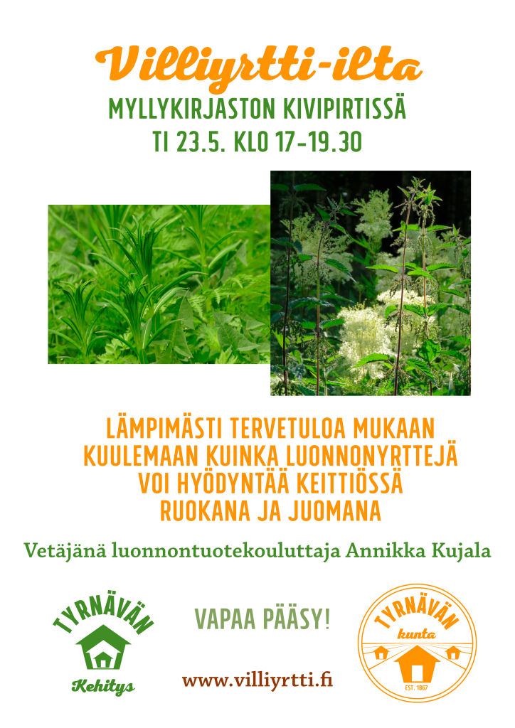 23.05.2023 17:00 - 23.05.2023 19:30 Villiyrtti-ilta ti 23.5. klo 17–19.30 Kivipirtissä Villiyrtti-ilta ti 23.5. klo 17–19.30 Myllykirjaston Kivipirtissä Villiyrtti-ilta ti 23.5. klo 17–19.30 Myllykirjaston Kivipirtissä. Vetäjänä Luontoäidin lumoama luonnontuotekouluttaja Annikka Kujala. VAPAA PÄÄSY, LÄMPIMÄSTI TERVETULOA MUKAAN! www.villiyrtti.fi Tapahtuman tarjoavat Tyrnävän kunta ja Tyrnävän Kehitys
