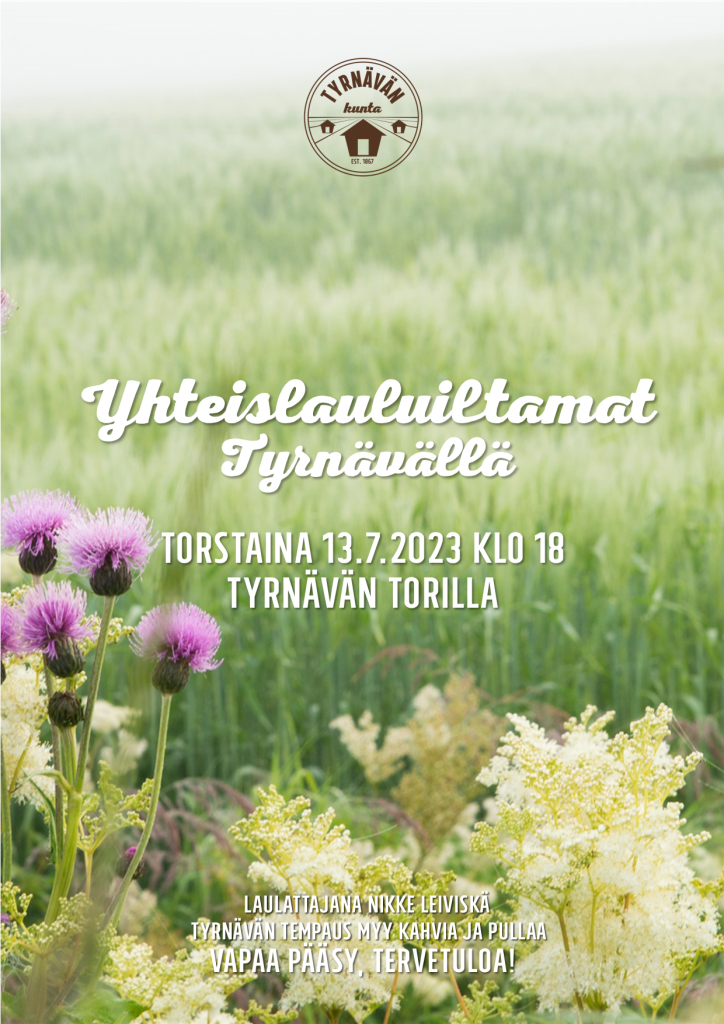 13.07.2023 18:00 - 13.07.2023 19:00 Yhteislauluiltama Tyrnävän torilla Yhteislauluiltama Tyrnävän torilla to 13.7. klo 18 TERVETULOA VIETTÄMÄÄN KESÄILTAA ILOISISSA YHTEISLAULU-TUNNELMISSA! Lauluiltaa vietetään Tyrnävän torilla to 13.7. klo 18. Laulattajana toimii Nikke Leiviskä. Tyrnävän Tempaus myy kahvia ja pullaa. Vapaa pääsy, lämpimästi tervetuloa!