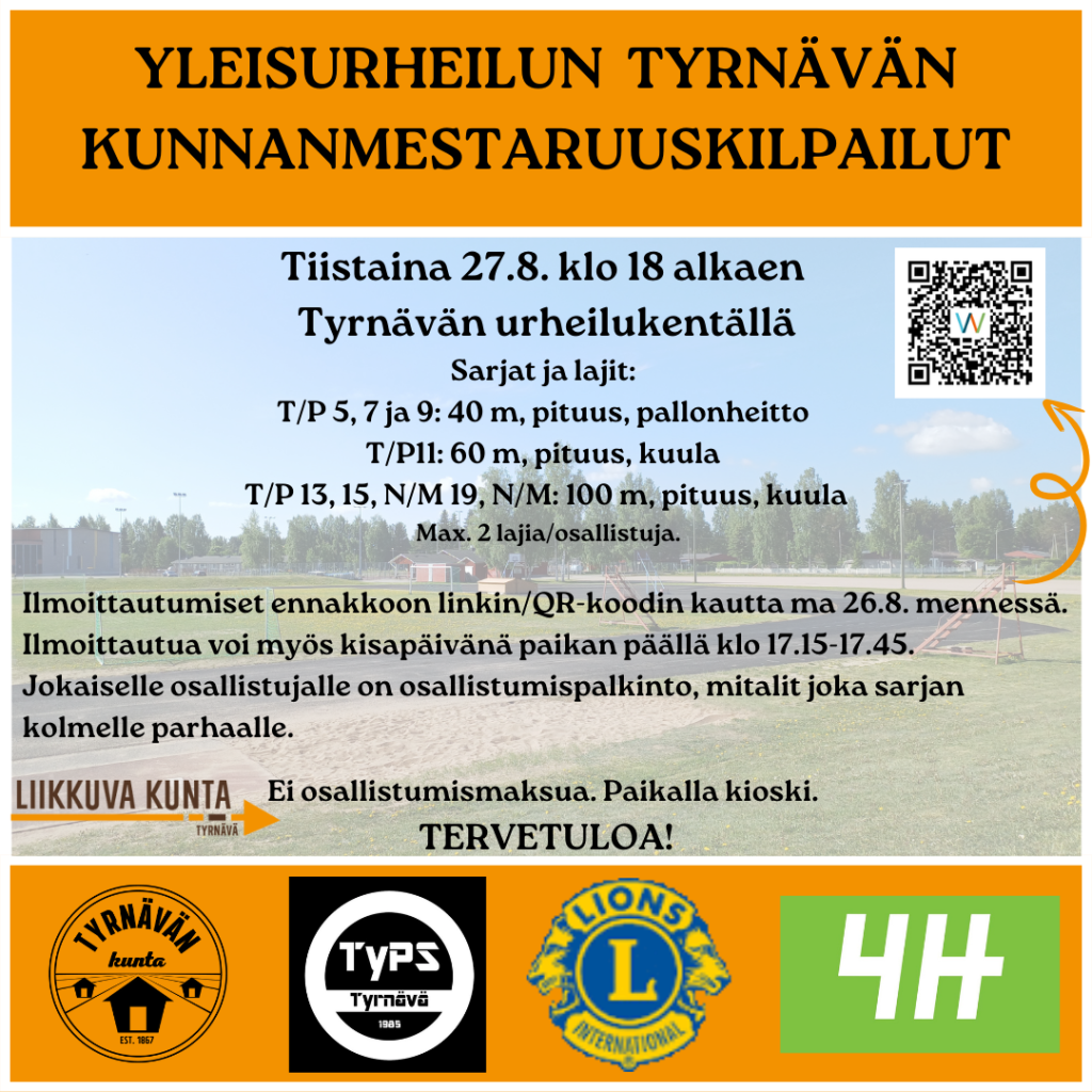 27.08.2024 18:00 - 27.08.2024 18:00 Yleisurheilun Tyrnävän kunnanmestaruuskilpailut Tervetuloa liikkumaan yhdessä yleisurheillen Tyrnävän urheilukentälle ti 27.8.! Linkki ilmoittautumiseen.