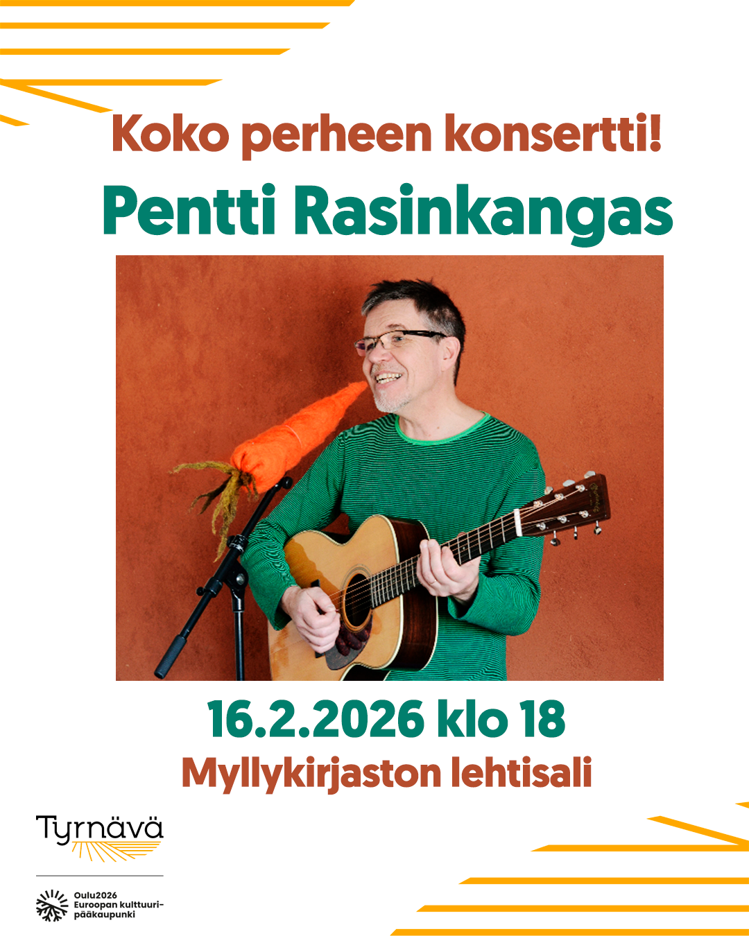 16.02.2026 18:00 - 16.02.2026 19:00 Ystävänpäiväkonsertti: Pentti Rasinkangas Ystävänpäiväkonsertti: Pentti Rasinkangas Maanantaina 16.2.2026 klo 18 Myllykirjaston lehtisalissa Pentti Rasinkangas on tehnyt ammatikseen lastenmusiikkia jo 1980-luvulta useissa eri yhtyeissä sekä paljon myös trubaduurina kitaransa kanssa. Tarinallisissa lauluissa on paljon hauskaa ja järjenvastaista höpöttävästä enosta; lapsista, jotka kaatavat isän kumisaappaan täyteen vettä; tädistä, joka ratsastaa lehmällä keittiöön. Hulluttelun vastapainona konsertissa toimii rauhallisuus – sitäkin on oltava. Esiintyessään hän on enemmänkin tarinankertoja kuin leikittäjä. Konserteissa pyritään leirinuotiotunnelmaan. Hänen laulunsa ja esiintymisensä on suunnattu myös aikuisille. Lastenkonserteissa kun on aina aikuisiakin. Hän on tehnyt parisenkymmentä lapsille ja koko perheille suunnattua levyä eri yhteyksissä ja saanut lukuisia palkintoja, mm. Lastenkulttuurin valtionpalkinnon Ohilyönti-orkesterin kanssa. Musiikkityyli on tyylipuhdasta Pupulaarimusiikkia (tarkkana oikeinkirjoituksen kanssa!). Tunnetuimmista lauluista voisi mainita mm. ”Meidän uusi vauva”, ”Mennään hiljaa”, ”Mamma Miau”, ”Oon, äiti, pieni lintu vain” ja ”Hajamielinen mies”. Mutta lauluja tulee koko ajan lisää. Uusin albumi ilmestyi 30.9.2024 (Pentti Rasinkangas ja Hajamieliset Jänikset). Lauluja löytyy hyvin Youtubesta, Spotifysta ja muista Titityistä. Spotify-osoite: https://open.spotify.com/artist/3MLtcY6tN3aUzppsYVBhI8?si=xZm9Np0wQ46Fdcn7UIB_Kw Kotisivu: www.huti.fi