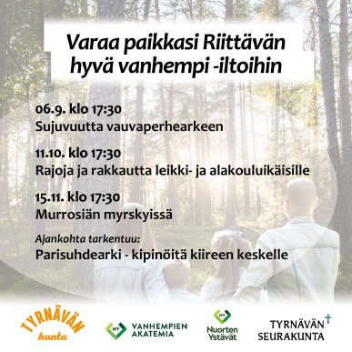 Varaa paikkasi Tyrnävän kunnan, Tyrnävän seurakunnan ja Vanhempien Akatemian tarjoamissa, maksuttomissa Riittävän hyvä vanhempi -illoissa!