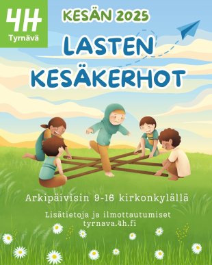 Julkaistu 12.05.2025 4H-kesäpäiväleirit käynnistyvät kesäkuun alussa – ilmoittautuminen on nyt auki! Kesäpäiväleirit käynnistyvät jälleen kesäkuun alussa ja jatkuvat juhannusviikolle asti. Kerho järjestetään kirkonkylällä. Muilta kyliltä voi osallistua kirkonkylän leiriin. Päiväleirit kokoontuvat klo 9–16 ja sisältävät lämpimän ruuan sekä välipalan. Paikkana toimivat 4H:n kerhotilat (vanha paloasema, Kunnankuja 4) ja liikunta-alueet. Päiväleiriohjelma koostuu eri toiminnoista, joihin vanhemmat voivat valita kolme pääkohtaa. Pidätämme oikeudet muuttaa toiveita, mikäli halukkaita on paljon. Vähäinen lapsimäärä voi myös vaikuttaa päiväohjelmaan. Päiväleirin hinta on 12,50 e / lapsi / päivä. Minimiryhmäkoko on 5 lasta / ryhmä, maksimi 12. Ryhmät jaetaan ilmoittautumisen jälkeen. Pääohjaajina toimivat koulutetut nuoret, heidän tukenaan on aikuinen. Päivähinta sisältää lämpimän ruuan sekä välipalan sekä askartelu- ja muun materiaalin. Leirimaksu laskutetaan leirin jälkeen. Laskuun lisätään laskun lähetyskulut 5 euroa. Leirin voi maksaa myös pankkikortilla, jolloin ei tule laskutuslisää. Ilmoittautumiset: https://tyrnava.4h.fi/4h-kesapaivaleiri/