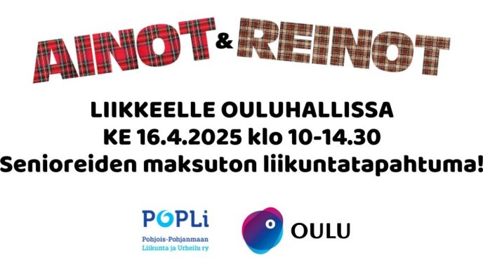 Julkaistu 08.04.2025 Ainot ja Reinot liikkeelle Ouluhallissa 16.4.2025 Vielä mahtuu muutama mukaan kyytiin! Lähde sinäkin mukaan Ainot & Reinot -tapahtumaan ke 16.4.2025 klo 10.00-14.30! Saat mahdollisuuden tutustua eri urheiluseurojen ja järjestöjen liikuntatoimintaan sekä alueen liikuntapalveluihin, kokeilla eri liikuntalajeja sekä saada ajankohtaista tietoa terveydestä ja hyvinvoinnista. Lisäksi tapahtumassa voi bongata maastohiihdon olympiavoittajan, MM-mitalistin ja asiantuntijan Sami Jauhojärvin. Tapahtuman päättää päivätanssit, jossa livemusiikista vastaa Reimarit & Heikki Saarela. Kuljetus tapahtumaan: Temmeksen Meijerin pihalta klo 9.15 S-Marketin edestä klo 9.30 Paluu takaisin lähtee viimeistään klo 14.30 Ouluhallilta Matka on maksuton ja mukaan mahtuu 50 henkilöä. Lisätiedot ja Ilmoittautumiset maanantaihin 14.4.2024 mennessä Helena Lithoviukselle, puh. 050 3221 460. Matkan järjestävät Tyrnävän kunta, vanhus- ja vammaisneuvosto sekä liikuntapalvelut. #MukavammanArjenKotikunta ##tyrnävänkunta