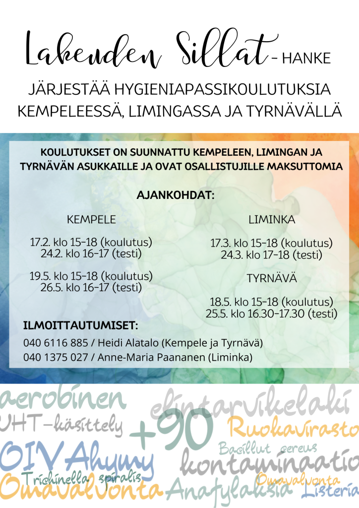 Julkaistu 20.04.2026 Hygieniapassikoulutus Tyrnävällä työikäisille Lakeuden Sillat -hanke järjestää hygieniapassikoulutuksen ja -testin Tyrnävällä. Ajankohta: 18.5. klo 15-18 (koulutus) 25.5. klo 16.30-17.30 (testi) Koulutus ja testi molemmat järjestetään Koivulassa, os. Kunnankuja 2. Koulutus ja testi ovat osallistujille maksuttomia. Ilmoittautumiset soittamalla tai viestillä numeroon 040 6116 885. Mainitse viestissä nimesi sekä asutko Tyrnävällä. HUOM! Koulutus ja testi on tarkoitettu tyrnäväläisille työikäisille (15-65-vuotiaat).