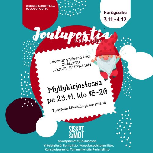 Julkaistu 28.11.2025 Joulukorttipaja 28.11.2025 klo 18–20 kirjastolla Hei kuntalainen, Lähde sinäkin mukaan kampanjaan, jotta mahdollisimman moni kuntamme ikäihminen saisi tänä vuonna lämpimät joulun toivotukset. Joulukortteja kerätään kotihoidon ja asumispalvelujen ikääntyneille asiakkaille. Järjestämme Joulunavaus-tapahtuman yhteydessä perjantaina 28.11. klo 18–20 Joulukorttipajan kirjastolla nuorten huoneessa, jossa voit käydä askartelemassa joulukortin keräykseen. Arjen pieniä iloja suo, joulukortti kampanjaan tuo. Pieni ele tää, ikääntyneen sydäntä lämmittää. Sytytä valo pimeyteen. Kosketa kortilla. https://www.siskotjasimot.fi/joulupostia-tyrnava/ #kosketakortilla #joulupostiaikäihmisille #sytytävalopimeyteen #joulukortti #jouluposti #tyrnävänkunta #MukavammanArjenKotikunta #meidäntyrnävä #kulttuurityrnävä #tyrnävänkirjasto #myllykirjasto #4htyrnava #siskotjasimot