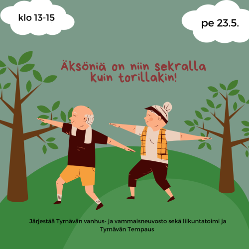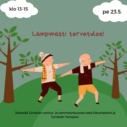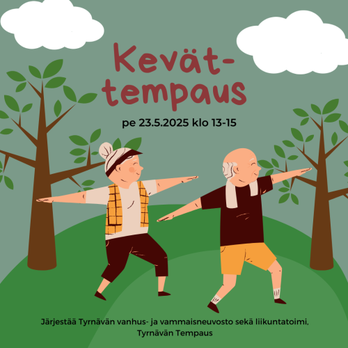 Julkaistu 23.05.2025 Kevättempaus tänään klo 13-15 Suuntaa siis kohti torialuetta. Lämpimästi tervetuloa! Järjestää Tyrnävän vanhus- ja vammaisneuvosto sekä liikuntatoimi ja Tyrnävän Tempaus