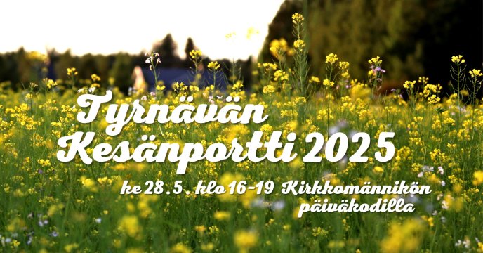 Julkaistu 28.05.2025 Kohta starttaa Tyrnävän Kesänportti – tervetuloa avaamaan Tyrnävän kesä! Tervetuloa mukaan yhteisölliseen Tyrnävän kesäkauden avaukseen Kirkkomännikön uuden hirsipäiväkodin piha-alueelle keskiviikkona 28.5. klo 16–19! O H J E L M A: Klo 16.45 Koko perheen bingo Klo 17.15 Runohetki Klo 17.30–18.00 Yhteislauluhetki, Tyrnävän seurakunta Klo 18.15 Liikkuvuutta lihaksille – koko perheen jumppahetki Lisäksi tapahtumassa on myytävänä makkaraa (käteis- tai korttimaksu) sekä polkuautorata lapsille. Tyrnävän kunta järjestää Kesänportin yhteydessä Kirkkomännikön uuden hirsipäiväkodin vihkiäiset ja avoimet ovet klo 16.00–18.30. Tutustumiskierroksia tiloihin on 15 minuutin välein, ja 300 ensimmäiselle on tarjolla kakkukahvit sisäpihalla! Tervetuloa avaamaan Tyrnävän kesä! Tapahtuman järjestävät yhteistyössä Tyrnävän kirkonkylän kyläyhdistys, Tyrnävän seurakunta, Tyrnävän Yrittäjät ja Tyrnävän kunta.