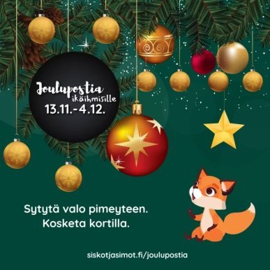 Julkaistu 04.12.2023 Lähde sinäkin mukaan kampanjaan, jotta mahdollisimman moni kuntamme ikäihminen saisi tänä vuonna lämpimät joulun toivotukset. Joulupostia ikäihmisille -kampanjaan voit osallistua 27.11.- 4.12. välisenä aikana. Joulukortteja kerätään kotihoidon ja asumispalvelujen ikääntyneille asiakkaille. Kortit toimittavat perille ikääntyneiden palveluiden työntekijät ️. Joulukortteja voi tuoda 27.11.-4.12. välisenä aikana kunnantalon Sentraalissa ja Myllykirjastossa oleviin keräyslaatikoihin sekä nonstoppina kunnantalon pääoven vasemmalla puolella olevaan postilaatikkoon. Arjen pieniä iloja suo, joulukortti kampanjaan tuo. Pieni ele tää, ikääntyneen sydäntä lämmittää. Sytytä valo pimeyteen. Kosketa kortilla. https://www.siskotjasimot.fi/joulupostia-tyrnava/ #kosketakortilla #joulupostiaikäihmisille #sytytävalopimeyteen #joulukortti #jouluposti #tyrnävänkunta #MukavammanArjenKotikunta #meidäntyrnävä #kulttuurityrnävä #tyrnävänkirjasto #myllykirjasto #4htyrnava #siskotjasimot