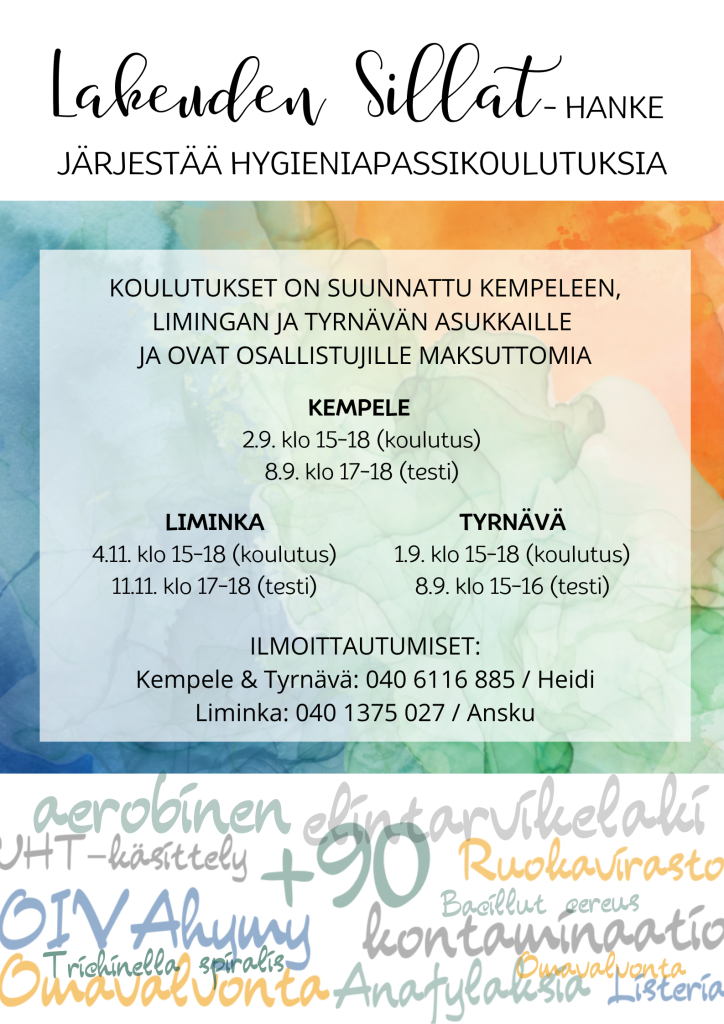 Julkaistu 26.08.2025 Lakeuden Sillat -hanke järjestää hygieniapassikoulutuksen ja -testin Tyrnävällä. Lakeuden Sillat -hanke järjestää hygieniapassikoulutuksen ja -testin Tyrnävällä. Ajankohta: 1.9. klo 15–18 (koulutus) 8.9. klo 15–16 (testi) Koulutus ja testi molemmat järjestetään Koivulassa, os. Kunnankuja 2. Mukaan mahtuu 10 osallistujaa. Koulutus ja testi ovat maksuttomia osallistujille. Ilmoittautumiset soittamalla tai viestillä numeroon 040 611 6885. HUOM! Koulutus ja testi on tarkoitettu tyrnäväläisille työikäisille (15–65-vuotiaat).