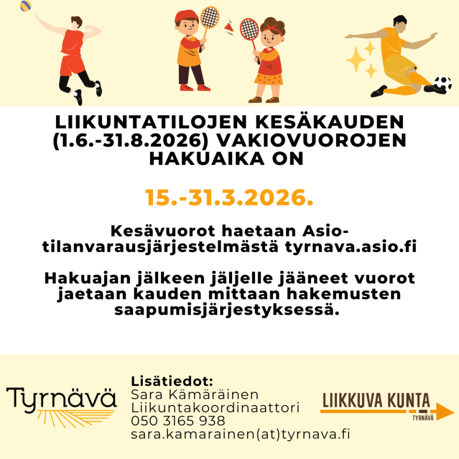 Julkaistu 24.03.2026 Liikuntatilojen kesän vakiovuorojen haku päättyy 31.3.2026 Liikuntatilojen kesäkauden (1.6.-31.8.2026) vakiovuorojen hakuaika on 15.-31.3.2026. hakeminen: tyrnava.asio.fi