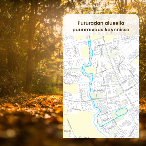 Julkaistu 27.10.2025 Pururadalla liikkujat huomio! Pururadalla on käynnissä mm. puiden raivausta: kaukalo - Fyrsenin kuja- kotiseututalo -akselilla. Huomio! Alueella liikkuu niin traktoreita kuin työkoneitakin. Noudatathan varovaisuutta liikkuessasi alueella, kiitos 🤎