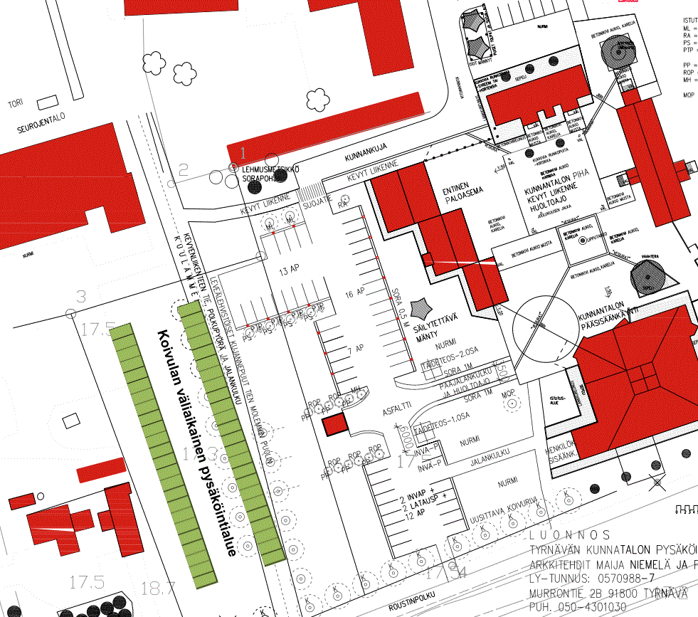 Julkaistu 01.09.2023 Tiedotus Koivulan pysäköintialueen käyttäjille Koivulan pysäköintialue poistetaan käytöstä ja otetaan Kirkkomännikön uudisrakennukselle työmaakäyttöön lähiaikana (työmaa aloitellaan ensi viikolla vko 36). Työmaa tulee kestämään useamman vuoden (p-alueet palautetaan käyttöön heti, kun työmaa ei aluetta tarvitse). Korvaavat pysäköintitilat on varattu Kunnantalon ja lämpölaitoksen välissä olevalle alueelle (kts karttaliite). Alueelle rakennetaan talven ajaksi auton lämmitysmahdollisuudet niitä tarvitseville. Pahoittelemme asiasta mahdollisesti aiheutuvaa haittaa.