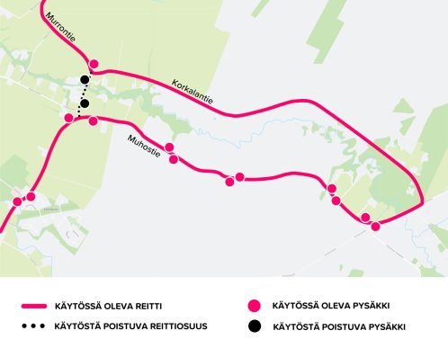 Julkaistu 17.04.2024 Tilapäinen poikkeusreitti joukkoliikenteessä Tyrnävällä 🚌 Oulun seudun liikenteen linjat 56 ja 56M on siirretty toistaiseksi liikennöimään poikkeusreittiä 16.4. alkaen johtuen tilapäisestä painorajoituksesta Murrontiellä. Poikkeusreitti liikennöidään Korkalantien kautta. Pysäkit Haarankauppa P ja Korkala E ovat tilapäisesti pois käytöstä. Ohessa karttakuva reittimuutoksesta. Päivitämme tietoa, kun linjat voidaan palauttaa normaalille reitilleen. #OulunSeudunLiikenne #Poikkeusreitti #Murrontie #Tyrnävä