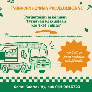 Julkaistu 24.03.2025 Tyrnävän kunnan palveluliikenne Palveluliikenne toimii kutsuliikenteenä kerran viikossa perjantaisin klo 9-14. Palveluliikenne on täydentävää joukkoliikennettä, jonka tavoitteena on tarjota edullinen kyytipalvelu esimerkiksi liikkumisen apuvälineitä käyttäville henkilöille tai ikääntyneille, joilla on vaikeuksia liikkua. Palveluliikennettä tarjotaan Tyrnävän kunnan alueella. Tyrnävän kunta tarjoaa asiointikuljetuksia kutsuliikenteenä 31.7.2025 saakka ja siitä eteenpäin on mukana kuljetushankinnassa eli tulee jatkumaan edelleen palvelu. Elokuussa selviää palveluntuottaja, josta ilmoitamme myöhemmin. Palveluliikenne toimii kutsuliikenteenä kerran viikossa perjantaisin klo 9-14. Kyyti tulee tilata edellisenä päivänä klo 16 mennessä. Kyydit varataan lähtökohtaisesti tilausjärjestyksessä. Palveluliikenteellä pääsee asioimaan Tyrnävän keskustaan. Palveluliikenteen tuottaa Kaartax Ay, kyyti tilataan numerosta 044 9815723. Palveluliikenteen maksu asiakkaalle on Oulun seudun joukkoliikenteen mukainen vyöhykehinta. Kuljettaja perii maksun asiakkaalta. Huom. mikäli tarvitset taksia terveydenhuollon palveluihin liittyen, tulee silloin käyttää KELA-taksia, lisätietoja terveydenhuollosta. Lisätietoja: henkilöstö- ja hyvinvointijohtaja Teija Eskola, teija.eskola@tyrnava.fi, p. 050 514 8673