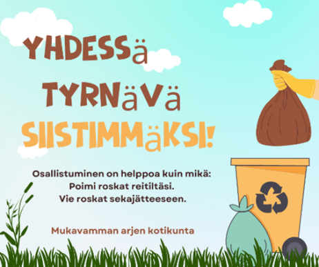 Julkaistu 27.05.2025 Yhdessä Tyrnävä siistimmäksi! Tiesitkö, että yhden purukumin hajoaminen luonnossa kestää jopa 20 vuotta! Tai muovisen karkkipussin hajoaminen kestää 100 vuotta! Näiden roskien paikka ei ole luonnossa, vaan roska-astiassa tai kierrätysastiassa. Huolehditaan yhdessä ympäristöstämme ja kannetaan vastuumme lähiympäristön siisteydestä. On siis aika ryhtyä tuumasta toimeen ja tehdä Tyrnävästä siistimpi ja viihtyisämpi! Roskia voi kerätä yhdessä kaverin kanssa, koiran kanssa lenkillä tai vaikka talkoillen oman kotitien asukkaiden kesken. Miten helppo tapa toimia ympäristömme hyväksi! Osallistuminen on helppoa! Ota mukaasi pussi ja hanskat. Lähde ulos nauttimaan kauniista säästä samalla keräten näkemäsi roskat pussiin. Samalla saat hyötyliikuntaa. Vie roskapussi kunnan tarjoamaan roskienkeruupisteelle. Roskienkeräyspisteet: Tyrnävän keskusta, tori Murto, koululammen vieressä Markkuu, Peukaloisen talo Temmes, meijerin piha-alue Roska-astiat tunnistat Yhdessä Tyrnävä siistimmäksi -julisteesta ja niitä tyhjennetään säännöllisesti. Iso kiitos jo etukäteen kaikille, jotka osallistuvat kampanjaan! #tyrnävä #MukavammanArjenKotikunta #meidäntyrnävä #YhdessäTyrnäväSiistimmäksi