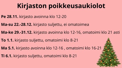 Ma-su 22.-28.12. kirjasto suljettu, ei omatoimea