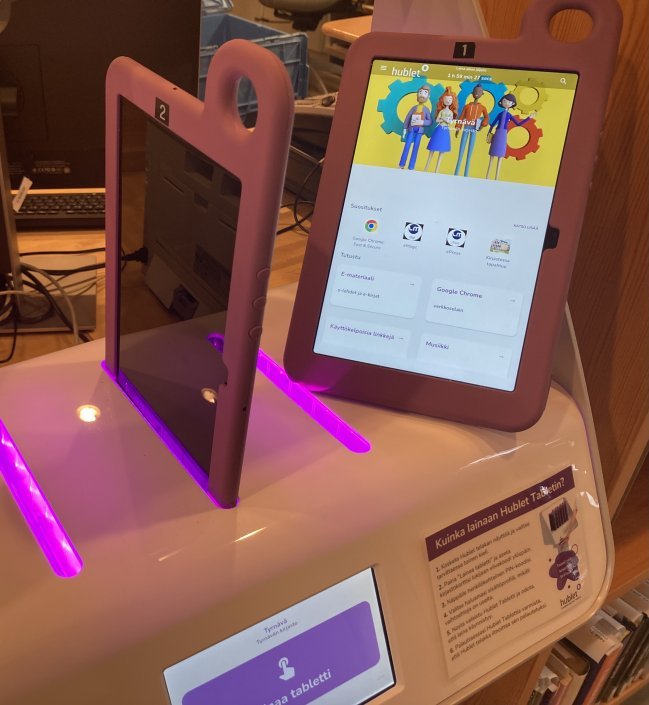 Kirjastossa on lainattavissa kolme Hublet-tablettia, joita voi käyttää kirjaston tiloissa kaksi tuntia kerrallaan.